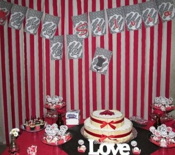 Chá de lingerie, por exemplo, pode ter uma cortina de papel crepom branco e vermelho.