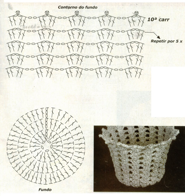 A outra careira deve ter 30 pontos altos e a última carreira do fundo deve ter 44 pontos altos. O “corpo” do potinho é feito com 2 pontos altos e 3 correntinhas na primeira carreira. As outas carreiras são feitas com 2 pontos altos, 2 correntinhas, 2 pontos altos dentro das correntinhas anteriores até chegar ao tamanho que você quer para ao seu potinho.