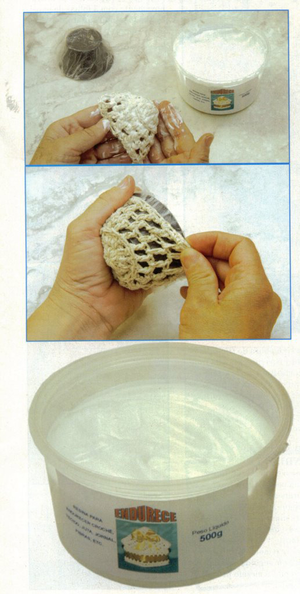 Para endurecer o seu potinho de crochê, aplique a resina endurecedora de crochê por fora e por dentro da peça, e coloque em um recipiente, para ser o molde, e deixe até secar.