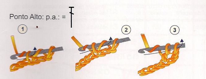 O último dos principais pontos de crochê é o ponto alto. O ponto alto é feito dando uma laçada na agulha e introduzindo a agulha no local onde você vai fazer o ponto. Lace a linha e puxe. Você vai ficar com 3 laçadas na agulha. Puxe a linha por dentro de 2 laçadas. E por último puxe a linha pelas duas laçadas restantes.