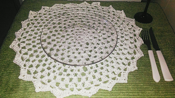 O sousplat redondo é feito da mesma maneira que o quadrado anterior, porém, em formato redondo.