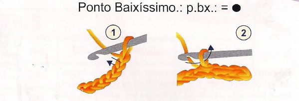 O ponto baixíssimo é o ponto que você vai utilizar para finalizar as carreiras do crochê das peças. Para fazê-lo, introduza a agulha na argola onde você quer fazer o ponto baixíssimo, puxe a linha passando-a diretamente na laçada da agulha, formando o ponto baixíssimo.