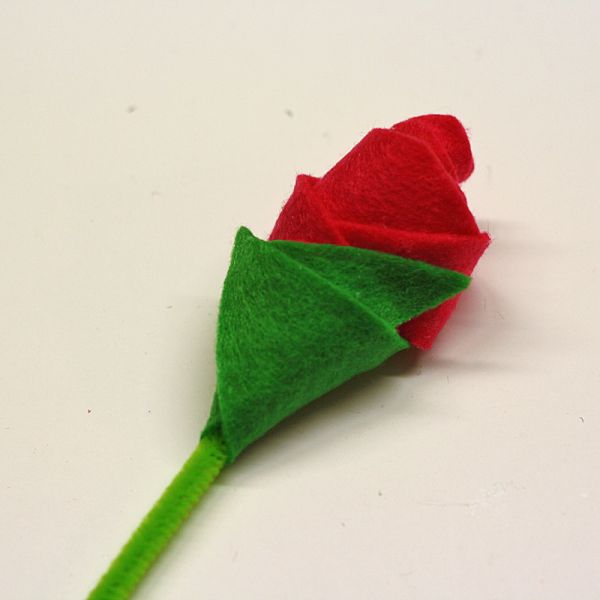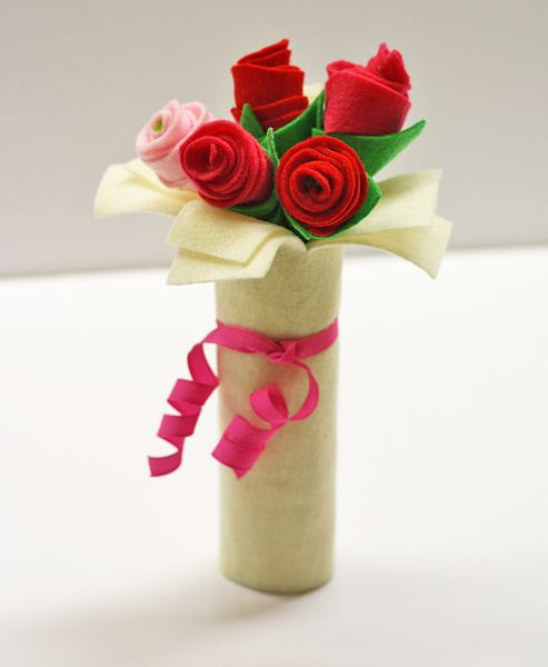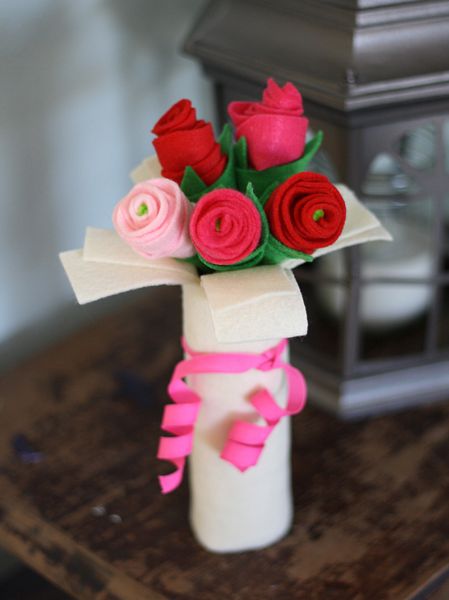 Em seguida, para finalizar a sua peça, vire a outra ponta do feltro para dentro e cole. E amarre um pedaço de fita em seu buquê. E está pronto!