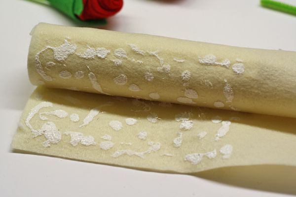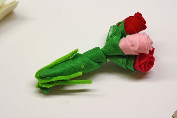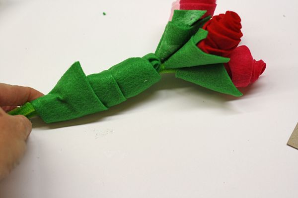 Em seguida, enrole esta tira de feltro ao redor de todas as rosas, colando para não soltar.