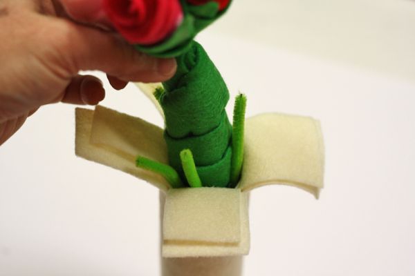 Agora, abra os pedaços de feltro para fora e coloque as rosas dentro do rolo de papel-toalha.