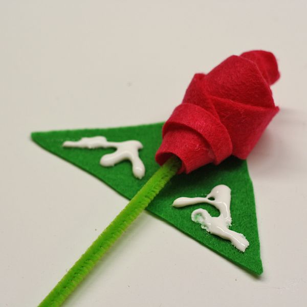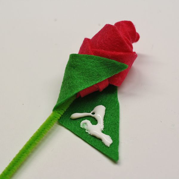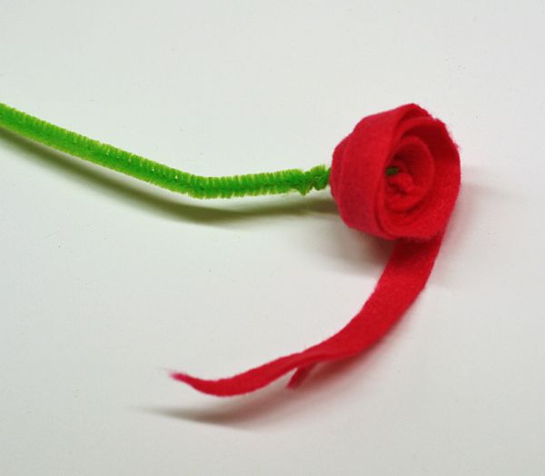 Agora, vá enrolando a tira de feltro ao redor do limpador de cachimbo, para criar a sua rosa. E a cada volta da tira de feltro pingue algumas gotas de cola para tecido, para manter todas as partes em seu lugar.