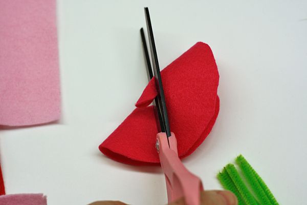Logo após, corte um quadrado no feltro verde. Depois corte esse quadrado ao meio, formando um triângulo, posicione a rosa no meio e aplique cola para tecido nas pontas laterais do triângulo.