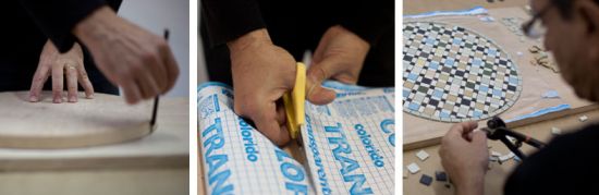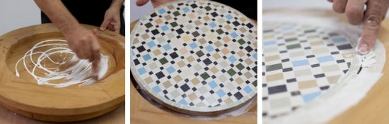 Para fixar o mosaico na base, corte o filme autoadesivo com o estilete para que o mosaico se solte da base. Vire o mosaico e retire o filme autoadesivo cuidadosamente. Com a espátula, passe a argamassa na base circular de madeira. Em seguida, passe uma camada fina de argamassa por cima do mosaico. Cole o mosaico na base circular e bata levemente com o taco de madeira para fixar as duas partes. Umedeça o papel Craft com a ajuda da esponja molhada e bata novamente com o taco para ajudar na fixação. Retire o papel Craft delicadamente.