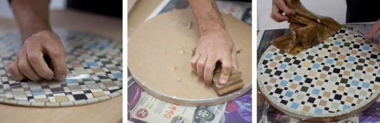 Passe cola branca na parte central do tampo de mesa e coloque o mosaico. Passe fita crepe na borda para proteger a madeira e, com a argamassa, rejunte o vão entre o mosaico e o centro da mesa. Espere secar e retire a fita crepe. Com o auxílio da estopa, passe a cera para dar o acabamento na madeira e no mosaico. E está pronta sua mesa com mosaico!