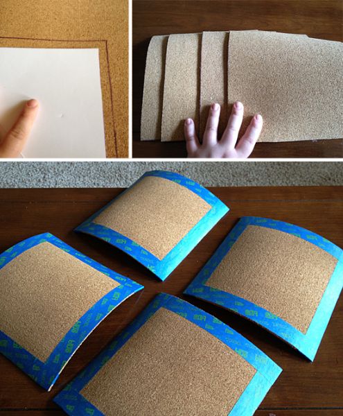 Em seguida, recorte a cortiça com os formatos de sua preferência e depois posicione pedaços de fita adesiva para delimitar o espaço onde você vai pintar. Neste exemplo a fita adesiva foi posicionada nas bordas, porém você também pode colocar pedaços de fita adesiva em outras posições, como formando listras ou outras formas geométricas.