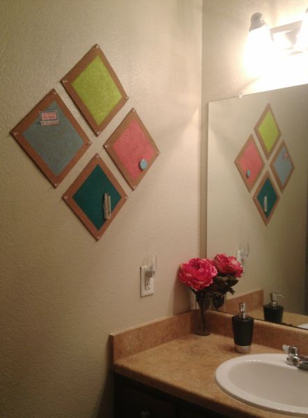 Agora, após a tinta estar totalmente seca, e para finalizar a sua decoração, comece a pendurar na parede as suas peças de cortiça, e neste momento você pode tanto usar ganchos para pendurar na parede ou fita adesiva dupla face, caso você não vá pendurar peças pesadas em seu mural de cortiça. E está pronto!