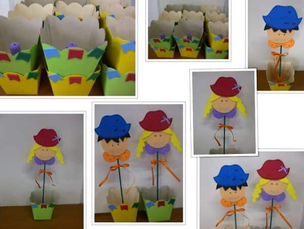 Utilize material reciclável em sua festa junina de forma muito fácil encapando caixa de leite vazia com retalhos de papel em formato de simpáticos caipirinhas.