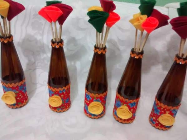 Os seus enfeites juninos também podem ser feitos com garrafas vazias ou com vasinhos velhos.