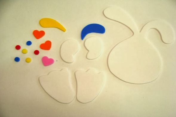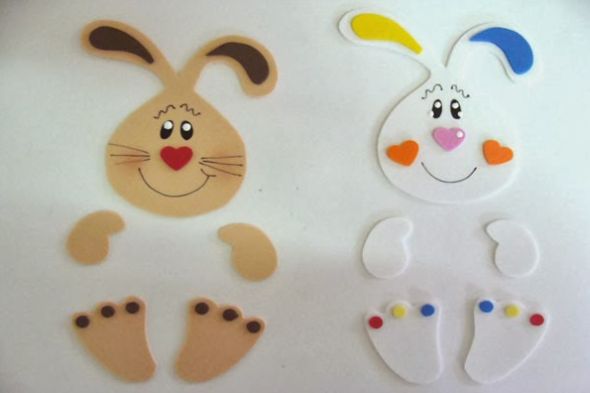 Comece transferindo todas as partes do molde para as cores dos EVAs escolhidos. E para fazer os detalhes do coelhinho, corte bolinhas coloridas e também corações, estrelinhas ou o formato que você quiser e também com as cores que você quiser.
