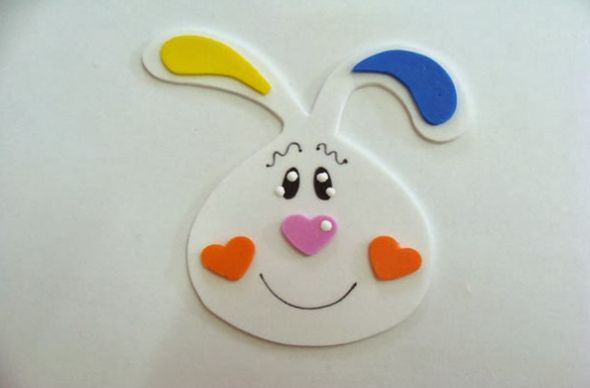 Em seguida, monte a carinha do coelho, colando, com o auxílio da cola quente ou da cola universal, as partes internas das orelhas, o focinho (que é um coração) e as bochechas (que também são coraçõezinhos). E desenhe com a caneta permanente preta os olhos, boca e sobrancelha, e finalize pingando gotas de tinta branca nos olhos e no focinho do coelho, para dar vida à fisionomia do coelhinho.