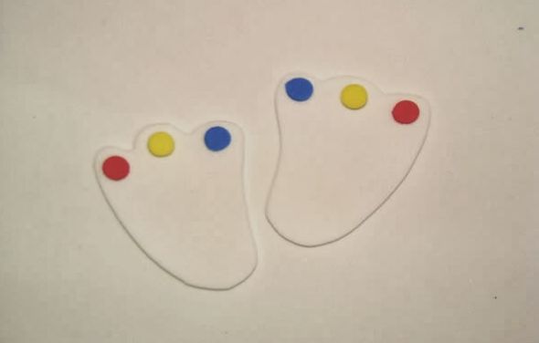 Logo após, monte as patinhas, colando bolinhas coloridas nas ”curvinhas” da patinha e um círculo maior no calcanhar.
