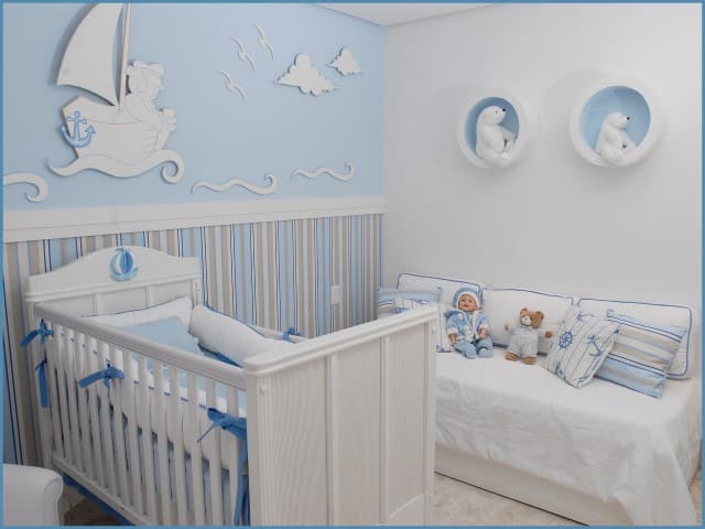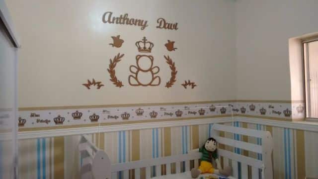 Invista em itens com muitas coroas, se quiser um décor de príncipe para o seu bebê. Fixe na parede apliques de MDF e faixinhas com coroas. Usar molduras douradas, kit higiene de louça e criar um décor azul e branco são outros ótimos recursos para o quarto do seu príncipe.
