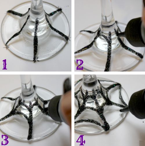 Para finalizar jogue glitter por toda a base da taça e cole a aranha com cola quente no topo da base da taça. E está pronta a sua decoração de taças!
