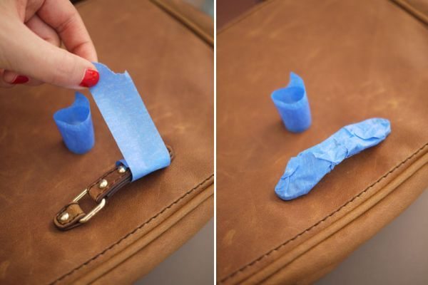 Comece protegendo as partes de sua bolsa onde você vai aplicar a decoupage, com pedaços de fita adesiva.