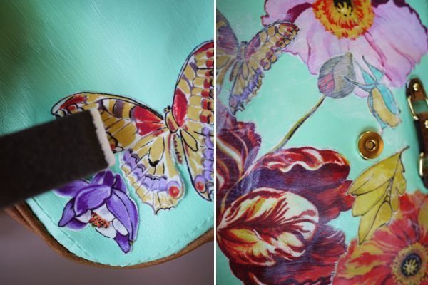Logo após, para finalizar a sua peça, assim que você tiver aplicados todos os motivos de tecido que você queria, aplique uma cada generosa de cola para decoupage sobre toda a parte customizada de sua bolsa. Deixe a cola para decoupage secar muito bem. E está pronto!