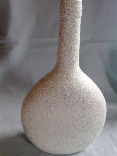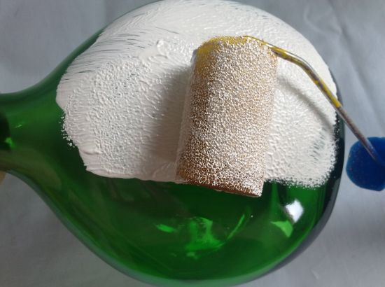 Comece retirando todos os rótulos e limpando muito bem a garrafa. Em seguida, passe uma camada da base e tinta acrílica para artesanato na cor branca, com o rolinho. Deixe secar muito bem e então aplique mais duas camadas, mas sempre deixando secar bem entre uma camada e outra. Ao final a garrafa deve estar completamente pintada.