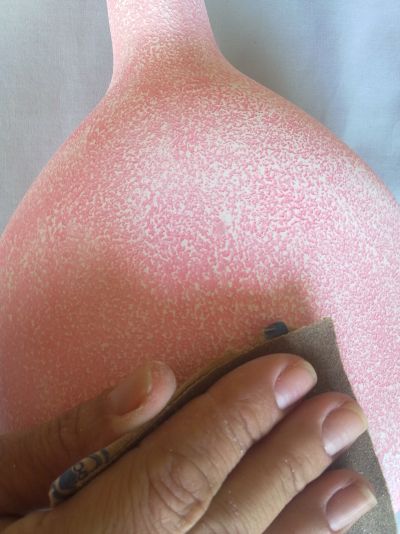 Logo após, prepare uma mistura com a base e tinta acrílica para artesanato rosa e um pouco de água. E aplique, com o pincel chato, em toda a garrafa a mistura já feita e espere secar. Depois, lixe para fazer um efeito de luz e sombra.