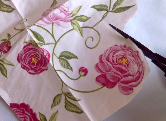 Recorte o motivo desejado do guardanapo para decoupage e retire as duas partes brancas, deixando apenas a parte estampada.