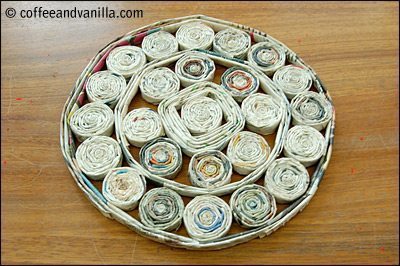 Para finalizar a sua peça, cole mais uma camada de círculos de canudos de jornal e canudos de jornal amassados na borda. E está pronto! Se você quiser, você também pode pintar o seu descanso de panela após montá-lo e, com a cor que você desejar.