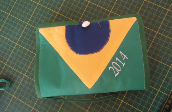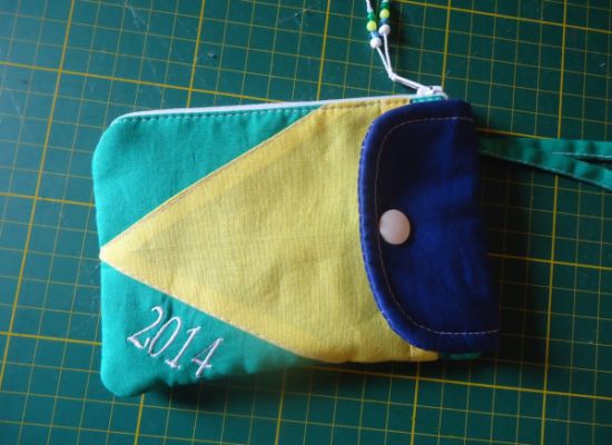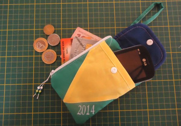 E para fazer um porta-celular, que também possui espaço para guardar moedas, dinheiro e cartões de crédito, você precisa apenas de uma noção sobre corte e costura e materiais como zíper, botão, tecidos com as cores relacionadas à bandeira brasileira e linha de costura que combine com estas cores. Pregue o zíper na lateral do porta-celular, para você poder acomodar dinheiro, mas já costurando a parte onde ficará o celular. Quando você for fechar a peça, costure junto a aba que irá fechar a parte onde o celular irá ficar e finalize a peça pregando o botão e colocando os detalhes que você quiser relacionados à Copa 2014.