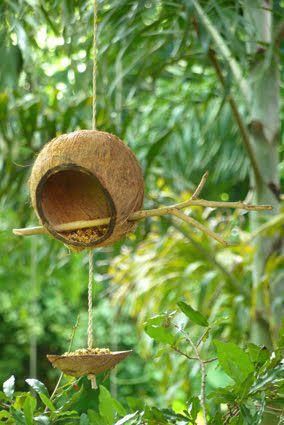 Mas há outros itens que podem ser feitos com a casca de coco, como o comedouro para pássaros, que além de decorar o seu jardim ainda alimenta um animalzinho.
