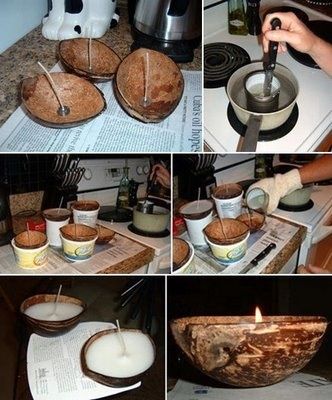 A casca do coco também pode servir de base para uma vela. E esta vela pode ser uma vela aromática, com a essência de coco também, de você preferir.