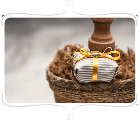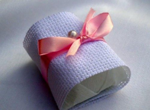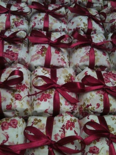 O bem casado pode ser embrulhado em papel crepom, em seguida usado uma pedaço de etamine colorido para decorar, uma fita de cetim e pérolas.
