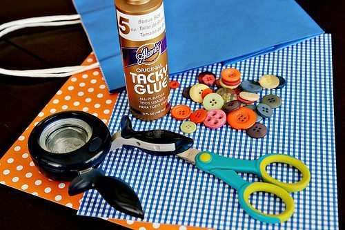 Logo após, comece a colar os botões escolhidos na sacolinha de papel, em posição logo abaixo da gravata borboleta.