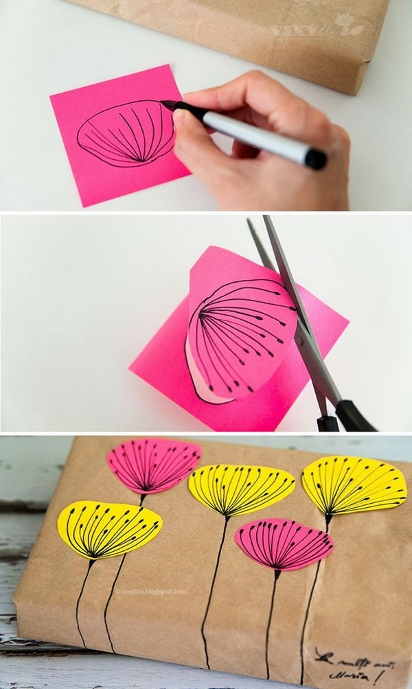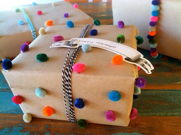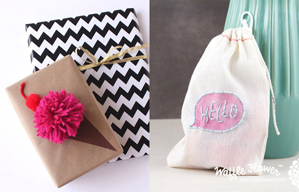 Até com papéis tidos como sem-graça e muito baratos, como uma folha de caderno comum, você cria lindos embrulhos para presentear. O grande segredo no momento de criar um embrulho criativo para o seu presente é abusar dos detalhes criativos, como adesivos fofos para fechar o saquinho de presente ou usar um enfeite inusitado, como um pompom de lã, por exemplo.