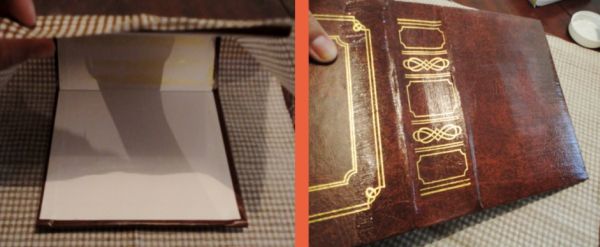 Em seguida, para finalizar a sua peça, cole novamente as folhas do álbum. Com o auxílio da cola tudo, cole as folhas, prenda com os grampos e aguarde secar. E está pronto!