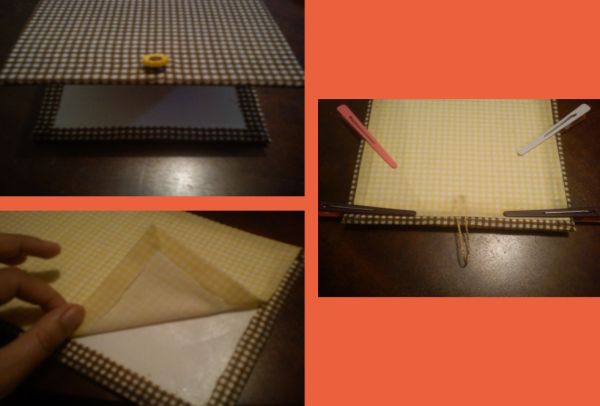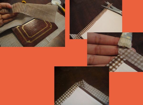 Agora, prepare o forro interno, cortando um pedaço de tecido com tamanho de 5 mm maior que o álbum. E faça uma barra com cola, para garantir com um bom acabamento. Cole esse tecido na parte interna do álbum. E nesta etapa, antes de colar o forro por completo, coloque um pedaço de elástico dourado sob o forro para poder prender no botão da capa. Espere secar. E se você quiser, prenda esta parte com alguns grampos para garantir que as pontas fiquem bem coladas.
