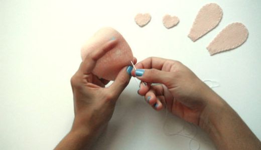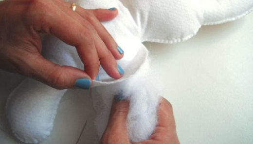 Logo após, sobreponha as partes cortadas do coelho em feltro branco (frente e costas) e inicie o fechamento da peça com o ponto caseado, recheando com o enchimento acrílico na medida em que a peça for sendo fechada.