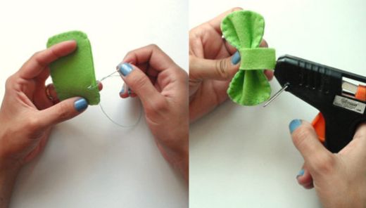 Agora, sobreponha as partes do laço cortadas no feltro verde e caseie toda a volta, mas sem enchimento. Para formar o laço, dobre e cole com a cola quente a tira cortada no feltro verde no centro do laço.