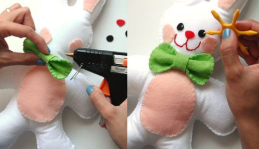Em seguida, cole todas as peças do seu coelhinho, barriga, orelhas, bochechas, nariz, olhos e o laço no corpo do coelho, com o auxílio da cola quente. E pinte a boca e os olhos do coelho com tinta para tecido.