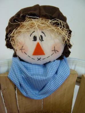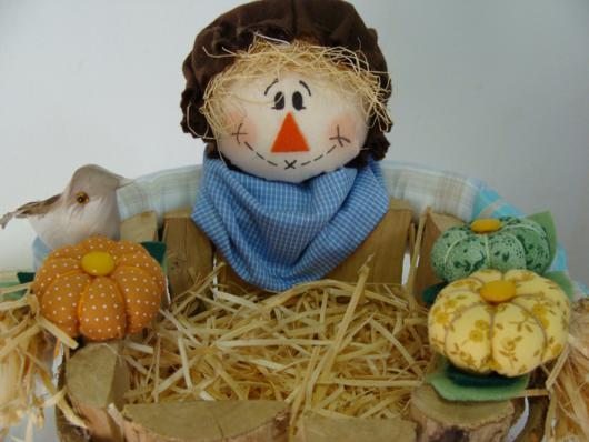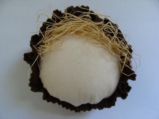 Para fazer o chapéu do espantalho corte um círculo no feltro com 19 cm de diâmetro. Alinhave as bordas do círculo, puxe a linha e monte com a cabeça do espantalho, posicionando a cabeça já feita dentro do chapéu de feltro e colocando palha como se fosse cabelo.