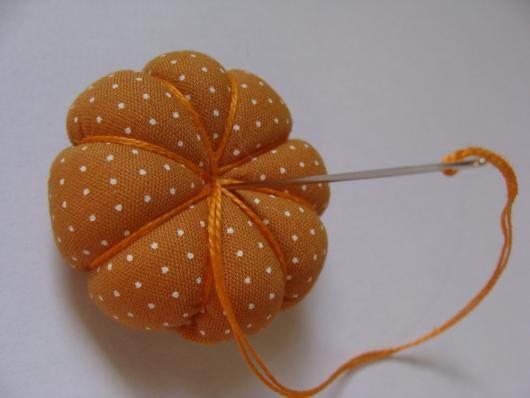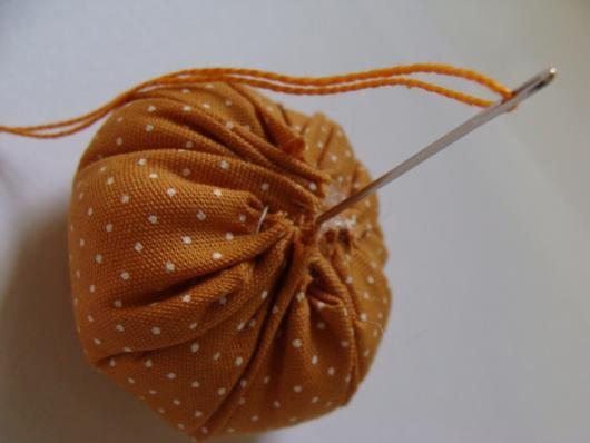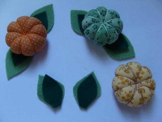 Para fazer as abóboras corte três círculos com 12 cm de diâmetro. Alinhave a borda do círculo, puxe a linha, encha com manta acrílica, termine de puxar a linha (arrematando e fechando a abóbora) e passe a agulha pelo centro chegando do outro lado. E para ficar com jeito de abóbora você deve pegar a agulha com a linha que você passou por dentro da bolinha e passar a linha ao redor de toda abóbora, formando gomos.