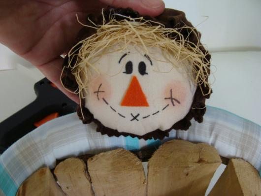 Cole o braço do espantalho ao redor do vaso de madeira utilizando a cola quente. Em seguida cole a cabeça do espantalho no meio do braço.