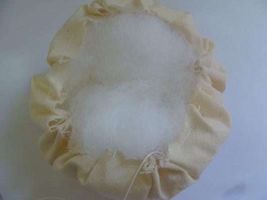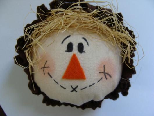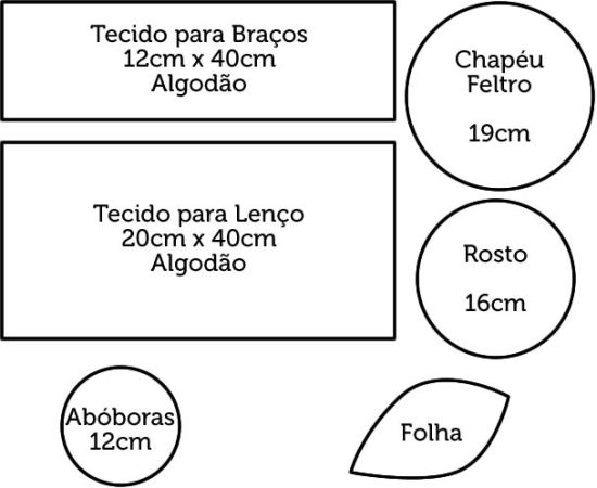 Para fazer a cabeça do espantalho você deve fazer um círculo com 16 cm de diâmetro em um tecido de cor clara. Alinhave as bordas, puxe a linha e encha com manta acrílica.