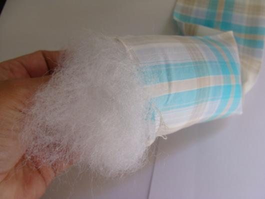 Comece transferindo o molde do braço do espantalho para o tecido. Esse tecido deve ter 40 cm x 12 cm. Dobre-o ao meio no sentido do comprimento e passe uma costura para fechar. E encha com manta acrílica, deixando aproximadamente três dedos no final sem encher.