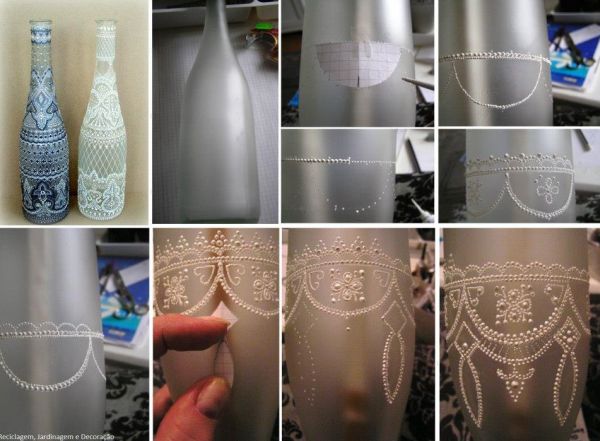 Com o próprio bico da tinta em bisnaga ou da cola 3d, fica a seu critério, faça bolinhas e traços em sua garrafa, criando um efeito parecido com renda ou com o modelo que você desejar. Para finalizar a sua peça, assim que fizer todos os desenhos pretendidos, deixe a tinta secar muito bem. E está pronto, se desejar pode finalizar envernizando a peça!