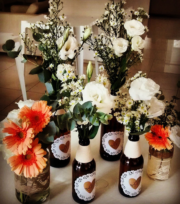 Enfeite de mesa com garrafa de cerveja é sempre lindo (Foto: floraflorinhaflora.blogspot.com.br)
