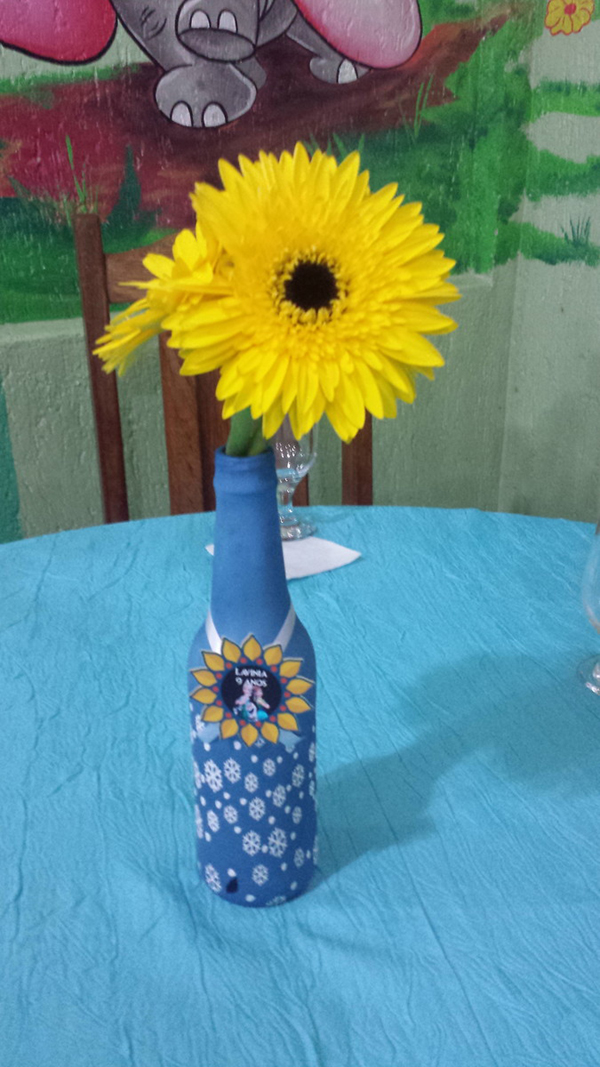Garrafas simples apenas decoradas com flores, fica bem criativo o ambiente!