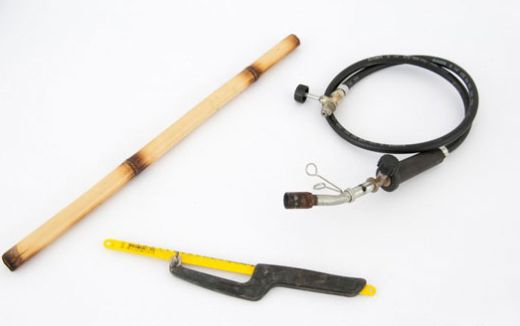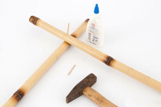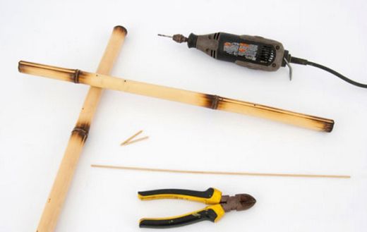 Em seguida, atravesse duas varas de bambu, com o auxílio da furadeira, mas deixando 10 cm em cada extremidade. Faça um furo onde ambas as varas se sobrepõem. Faça outro furo a 5 cm de distância do primeiro. Depois, com o auxílio do alicate de corte, corte pedaços de 3 cm do fio de cobre.