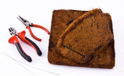 Para fazer esta linda peça você irá precisar de: forma de alumínio com tamanho de 20 × 20 cm; tesoura; 1 m de arame; alicate de bico; alicate de corte; par de luvas de borracha; 8 varas de bambu com comprimento de 50 cm com 3 cm de diâmetro; 4 peças com 6 centímetros vulcanizada ou fio de cobre de 1,5 mm (25 cm); martelo; queimador; furadeira e broca; vasinho de plástico para molde; fibras de coco; cola para fibra de coco; e cola branca comum.