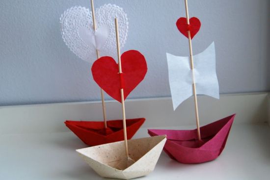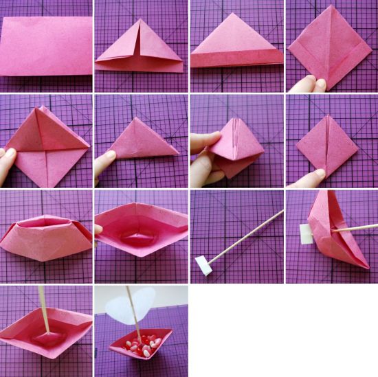 Para fazer os barquinhos da imagem do início da matéria você irá precisar apenas de papel colorido (com a cor que você quiser), palito, e de corações recortados em papéis especiais ou coloridos. Para fazer o barquinho é simples, basta utilizar um retângulo de papel (com o tamanho que você quiser) e seguir a sequência da dobradura da imagem a seguir. E após fazer o barquinho, você encaixa o palito no centro do barquinho e coloca um papel por baixo para não escapar e enche o barquinho com bala ou outras guloseimas. E na parte de cima basta passar pelo palito os corações já recortados.